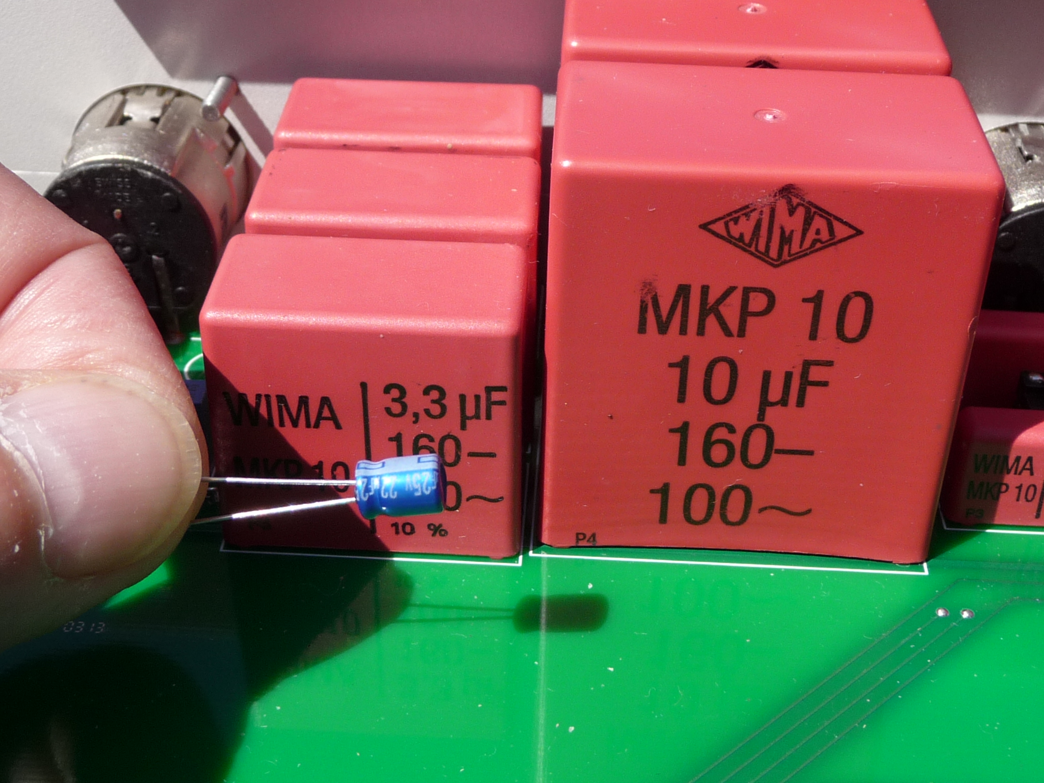 In the first photo above, you can see my "holy trinity" (two CMC3-MK41 at 110° and the CMC3-MK2 in the centre) and, in the two shots on the right, the original "body" of a CMC3 and, below, a modified one (note the red Wima polypropylene caps). The following two shots show the inside of the "preamp-crossover-mixer" unit, which is made to be the state-of-the art, totally wire-free. In the two photos below, you see, on the left, the crossover-mixer circuit and, on the right one (where I hold a small cap in my fingers), you can note the physical difference in dimensions between an electrolytic capacitor and a group of polypropylene red caps, which, paralleled together, provide the same capacitance as the small electrolytic cap in my fingers: it’s quite amazing the difference in dimensions, but there is also a big difference in sound and ... price too!