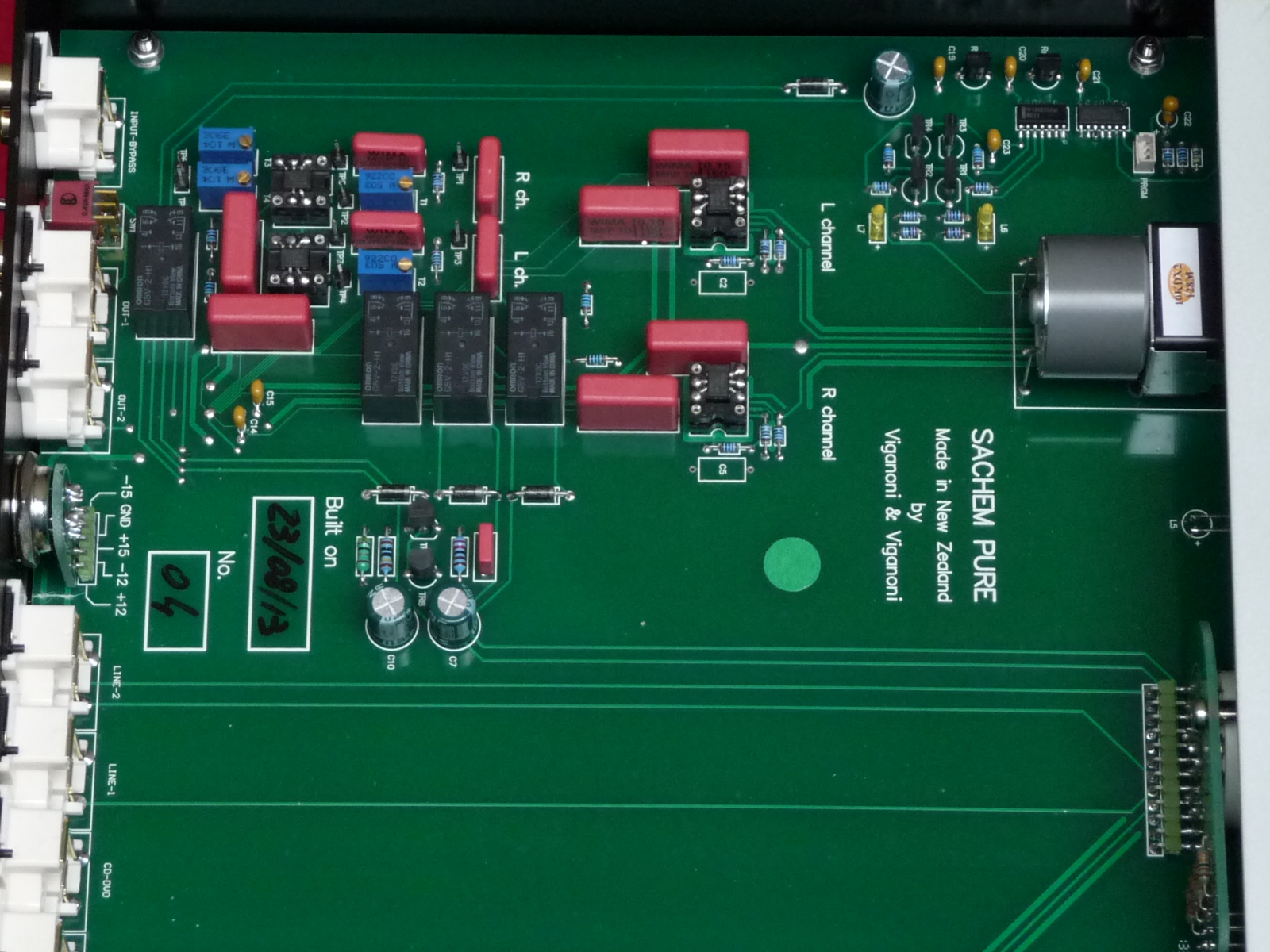 The pure is quite insensitive to external interferences, but due to its incredible frequency response (totally flat from DC, that means 0Hz, to 4MHz, that means 4 million Hz), if you live in an area saturated by radio frequencies and/or magnetic fields (these eventualities are quite rare in NZ), there could be the chance that the pure picks up some of them. In this case, we can try to stop them by putting a capacitor of tiny capacitance (47pF, in polystyrene) on the signal path, in order to limit the frequency response at 160kHz (-3 dB). The PC-board is already predisposed to take the small “intruder” and fitting it takes just a few minutes. I don’t think that you will hear any sonic difference, because this component is of minimal capacitance and top sonic quality too.