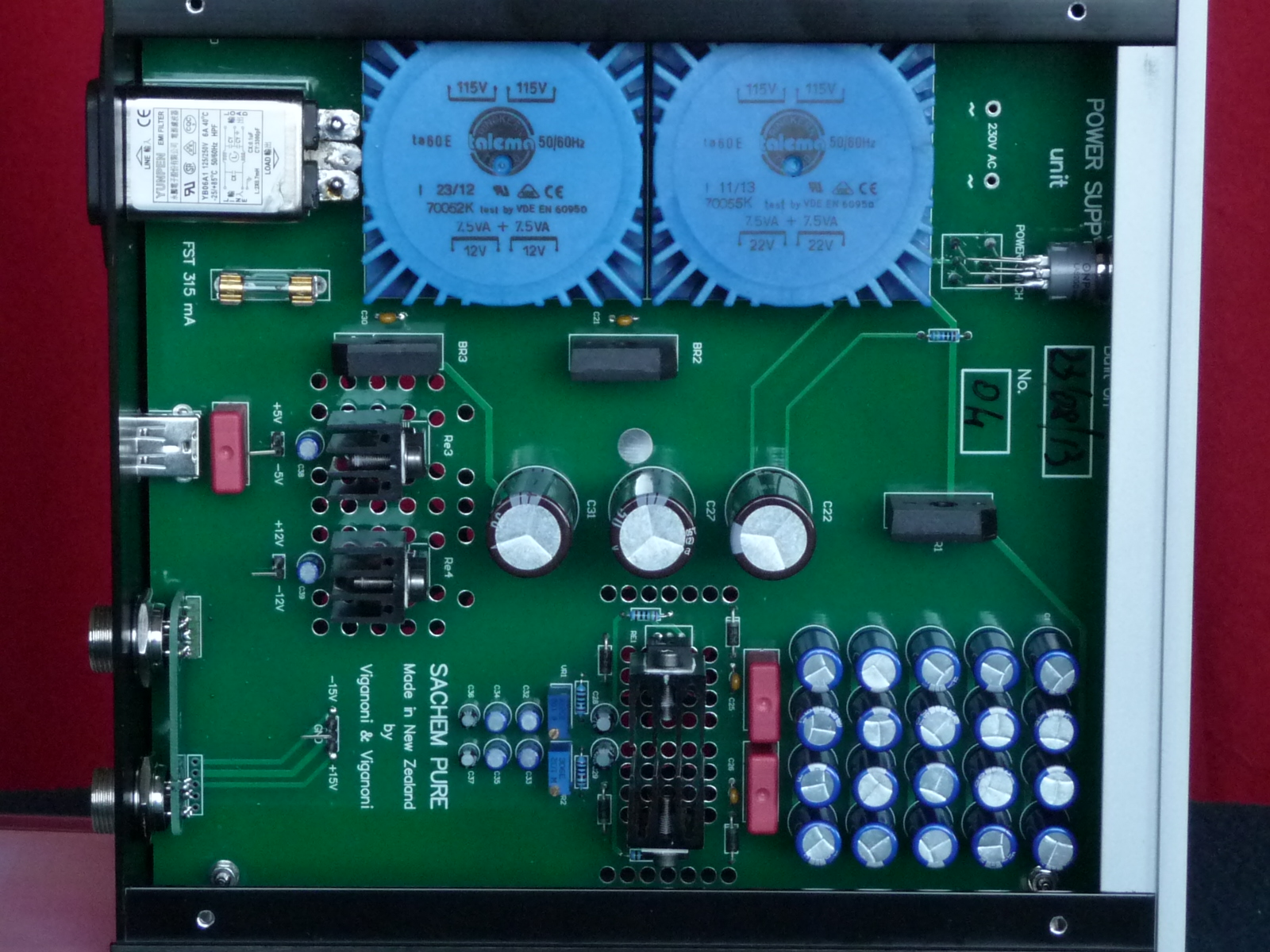 This unit features two over-dimensioned 15VA toroidal transformers, feeding twenty audio-grade, very low impedance and low ESR capacitors, through a 6A full-wave bridge rectifier. The block of capacitors features a total capacitance of 9,400μF and is integrated by two exceptional, high-speed WIMA polypropylene caps (MKP10 series).